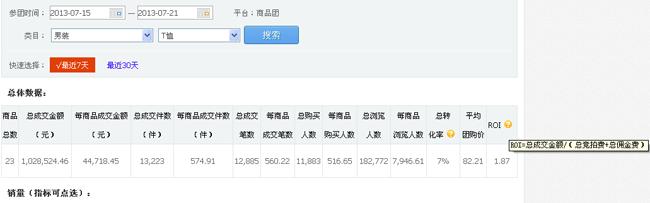 在收益方面,下圖是聚算平臺公布行業數據(2013.7.15-2013.7.21),單品銷售額4.4萬元,ROI是1.87,這就意味著賣出4.4萬元將有2.35萬元交給平臺。當然這只是淡季的一個極端的例子,目前大部分的ROI在4-10之間。