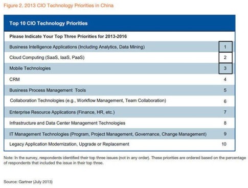 根據Gartner最新報告,2013-2016年中國CIO最關注的三大技術應用依次是:商業智能、云計算和移動技術,未來三年中國企業將在這三個領域加大投入。