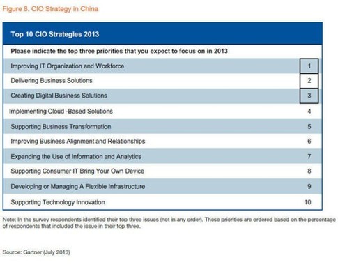 2013年中國企業CIO的十大戰略中,前三名按優先級排序依次是 1.提升IT部門與人員素質 2.交付業務解決方案 3.開發數字業務解決方案。