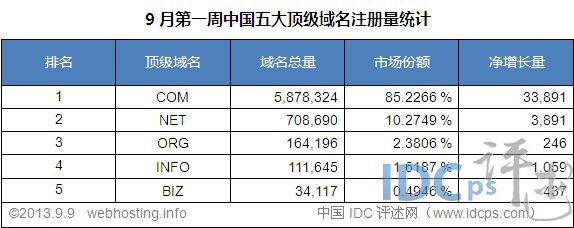 在9月第一周(9月3日-9月9日)期間,五個頂級域名均增勢良好。其中,.COM域名新增33,891個;.NET域名新增3,891個;.ORG新增246個;.INFO新增1,059個;.BIZ新增437個。