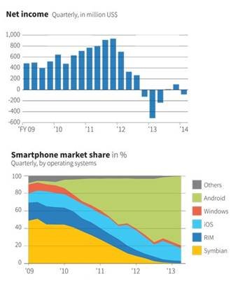 雖然有很多人認為黑莓的下滑是從蘋果 2007年推出第一代 iPhone開始的,但下滑的原因究竟是什么呢?從Gartner信息技術研究和分析公司本周二給出的數據來看,在蘋果推出 iPhone 一年之后,也就是2008年6月,黑莓的股價曾一度達到了歷史最高的 150 加元,甚至在 2009 年的時候黑莓在手機市場中所占的比重也相當可觀。事實上,從數據可以看出,正是在摩托羅拉 Droid 系列和 Nexus One 開啟了Android平臺的迅猛增長之后,黑莓的業績才開始出現明顯的下滑。