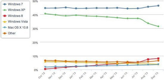 雖然微軟已經親盡全力推廣同時具有移動互聯網和傳統PC特性的Windows 8系統,但似乎消費者對這種結合并不買賬。根據最新網絡流量數據顯示,雖然Windows 8目前已經占據了主流桌面系統流量的8%,但相比Windows 7的46%甚至是已近遲暮的XP(31%),仍有較大的差距。