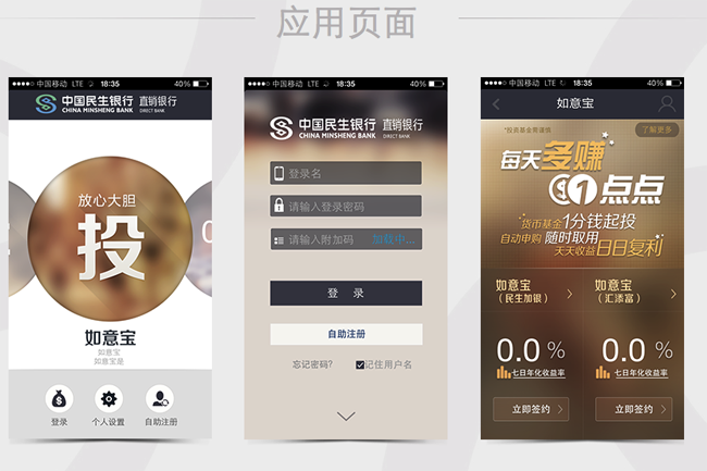 民生直銷銀行還有Android和iOS手機客戶端,以及微信公眾賬號。網頁版上的操作都可以在手機客戶端上完成,微信公眾賬號內可以查詢賬戶,轉入轉出資金,查詢如意寶。