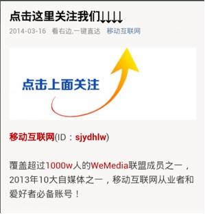“移動互聯網”賬號通常也會在頁面底部提示大家點擊閱讀原文進行關注,其實也是利用這樣的方式;只是跳轉了一個頁面,比如點擊閱讀原文后跳轉到這么一個提示頁面: