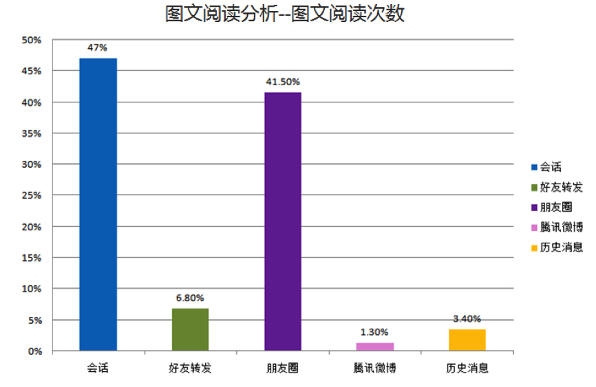 從以上兩個柱狀圖可以看出通過會話(通過公眾號下發的界面)和朋友圈,是圖文閱讀人數和次數的主要來源渠道,好友轉發和歷史消息其次,而騰訊微博轉化作用可以忽略不計(也跟賬號是否在騰訊微博宣傳和相應微博粉絲數有關)。