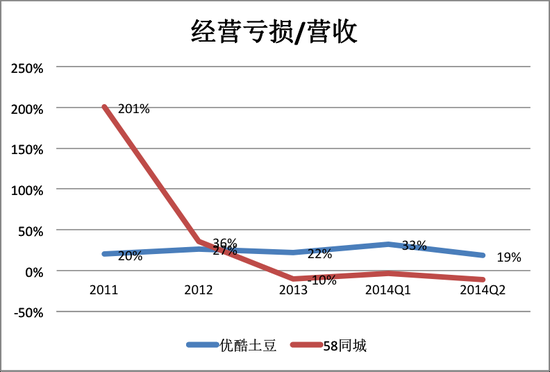 從2011年算起,到2014年上半年,58同城、優酷土豆累計虧損分別為9100萬美元、2.84億美元,它們每虧損1美元換來的市值分別為37美元和15美元。