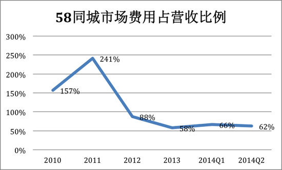 巨額的廣告投放,數千人的線下業務員團隊使58同城市場費用占營收的比例居高不下。2011年市場費用突破1億美元,相當于營收的241%,此后有所回落。2013年及2014年前六個月,基本穩定在營收的60%左右。