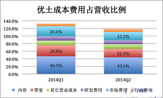 優酷土豆的三大負擔是內容、帶寬及市場費用,2014年Q2分別相當于營收的43.6%、22.3%和22.2%。