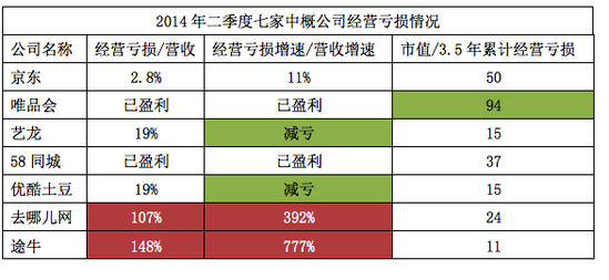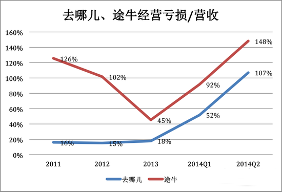 從2011年算起,到2014年上半年,去哪兒、途牛累計虧損分別為1.42億美元、和8040萬美元,它們每虧損1美元換來的市值分別為24美元和11美元。