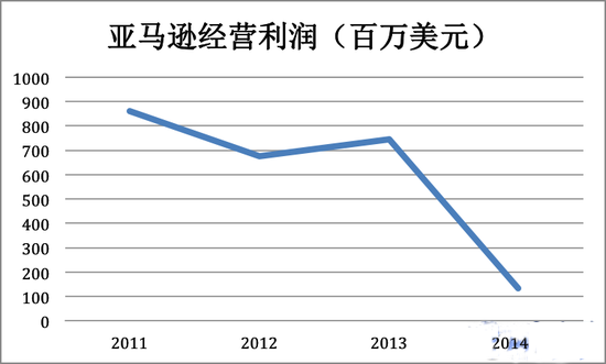亞馬遜以利潤換市場不假。營收從2011年的481億美元增到2014年上半年的391億美元。同期,經營利潤從8.6億美元降至1.3億美元。