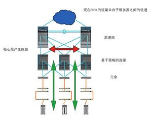 傳統(tǒng)的企業(yè)網絡通常由三個層次組成:服務器連接到接入層,再經匯聚層,最后到基于策略的連接和高速路由核心層。80%的流量流向來自于接入層到核心層,與在網絡上只有20%流向是來自于冗余和備份(如圖所示)。