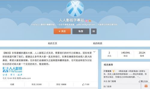 2014年12月20日上午,人人影視官方微博發(fā)布了一條消息稱(chēng),人人影視正式關(guān)閉,未來(lái)或繼續(xù)為正版商提供翻譯服務(wù),也可能會(huì)轉(zhuǎn)變?yōu)橛懻撋鐓^(qū)。人人影視陪伴了我們多年,關(guān)于人人影視,你應(yīng)該知道這8件事