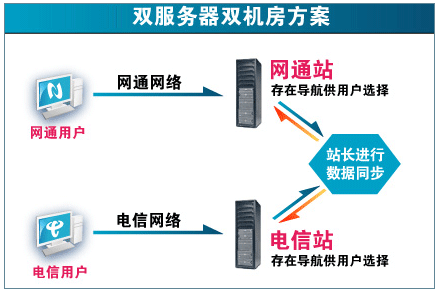 實(shí)際是一個(gè)網(wǎng)站分別租用兩個(gè)服務(wù)器,分別放在電信機(jī)房和網(wǎng)通機(jī)房, 然后讓電信用戶訪問電信站點(diǎn),網(wǎng)通用戶訪問網(wǎng)通站點(diǎn)。這樣讓用戶獲得最好的網(wǎng)絡(luò)速度。