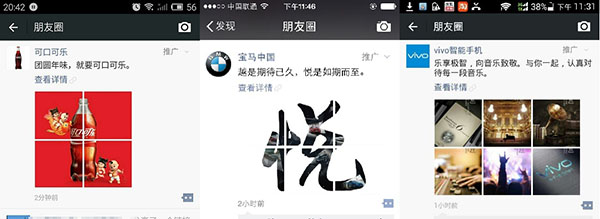 “刷了半天發現是個 Vivo 的廣告,感覺一下子不好了!”近日微信朋友圈信息流廣告首批上線,寶馬中國、Vivo 智能手機和可口可樂的廣告出現在每個人的朋友圈信息流里,但是每個人只有一個。所以瞬間全體微信用戶被貼上了三個標簽:刷出寶馬廣告的,刷出 vivo 廣告的和刷出可口可樂廣告的。