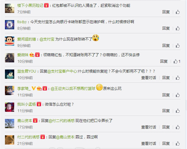 在支付寶官方微博的評論中,不少網友都表示目前支付寶的轉賬功能已經無法使用了,在網絡連接正常的情況下,進行轉賬等操作時,會出現“系統錯誤”、“網絡不給力”等字樣,導致操作失敗。不過紅包功能卻能正常使用。也有網友表示,他們的紅包功能也出現問題,整個支付寶基本上處于癱瘓狀態。