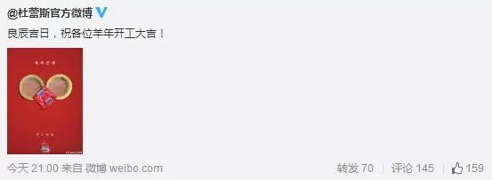 用杜杜做了一個羊頭的造型,開工大吉,簡單直接,惡搞元素是杜杜一貫作風(fēng),文案上沒能發(fā)揮極致,此條略顯平淡。