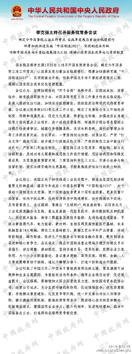 國務院總理李克強3月25日主持召開國務院常務會議,確定今年國務院立法工作重點,讓改革發展沿著法治軌道前行;部署加快推進實施“中國制造2025”,實現制造業升級;聽取中國北車南車重組進展情況匯報,強調以國資國企改革優化資源配置。