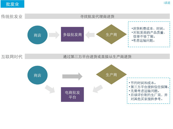 傳統(tǒng)批發(fā)業(yè)有極大的地域限制,一個想在北京開家小禮品店的店主需要大老遠的跑到浙江去進貨,不僅要面對長途跋涉并且還需要面對信任問題。所以對于進貨者來說,每次批發(fā)實際上都是一次風險。