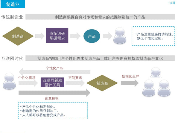 傳統(tǒng)的制造業(yè)都是封閉式生產,由生產商決定生產何種商品。生產者與消費者的角色是割裂的。但是在未來,互聯(lián)網會瓦解這種狀態(tài),未來將會由顧客全程參與到生產環(huán)節(jié)當中,有用戶共同決策來制造他們想要的產品。也就是說,未來時代消費者與生產者的界限會模糊起來,而同時傳統(tǒng)的經濟理論面臨崩潰。這也是注定要誕生的C2B全新模式。