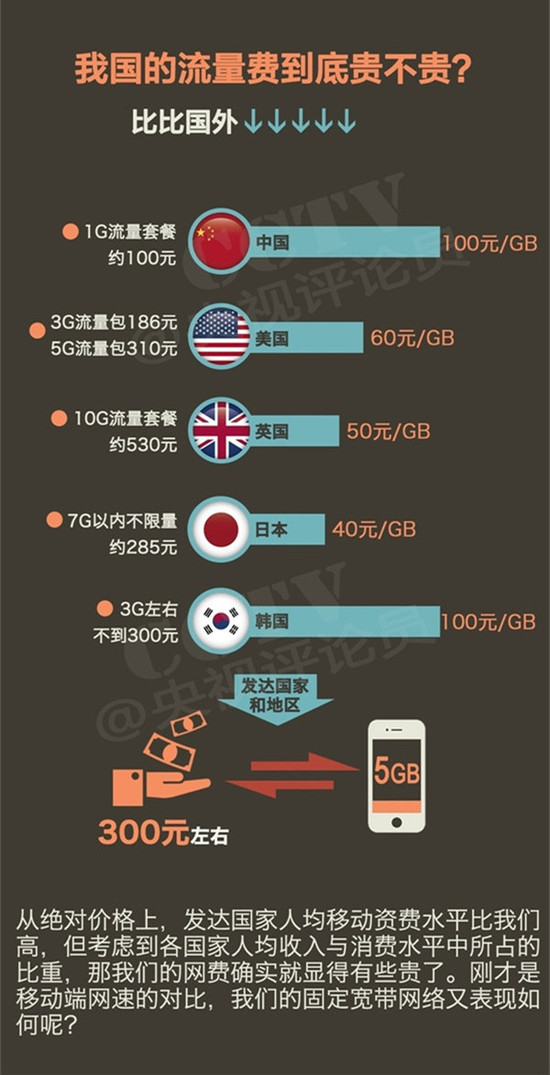 李克強(qiáng)總理公開表示,國內(nèi)的流量費(fèi)太高了,這導(dǎo)致了很多人到什么地方先問‘有沒有WiFi’。隨后工信部回應(yīng)稱,努力讓網(wǎng)速更快、價(jià)格更低。國內(nèi)的網(wǎng)費(fèi)到底貴不貴呢?下面這張圖進(jìn)行了解讀。