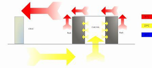 服務(wù)器機(jī)柜前方,經(jīng)機(jī)柜網(wǎng)孔門被服務(wù)器設(shè)備吸入,熱風(fēng)被機(jī)柜排出后自然回風(fēng)或通道吊頂、風(fēng)道回風(fēng)至空調(diào)上方的回風(fēng)口,完成一次制冷循環(huán)。