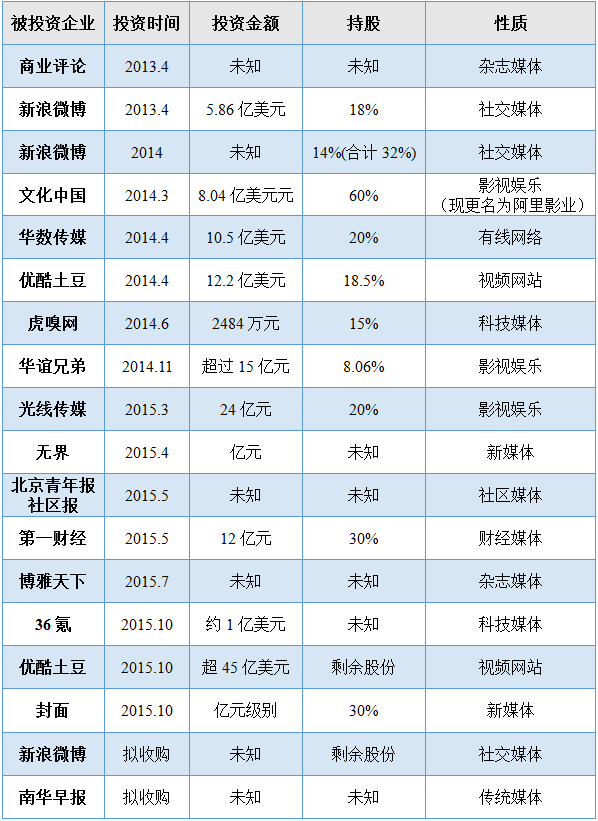阿里巴巴以電子商務起家,已經吸引了數以億計的龐大用戶群,之后進入互聯網金融、泛娛樂產業、健康產業、傳媒產業等,打造了一個正反饋的正強化生態系統。阿里巴巴通過在傳媒業的一系列的并購,已經成功在視頻、社交媒體、傳統媒體、電影業、新聞客戶端等傳媒業領域布局,傳媒帝國已然成型,具體見下表。