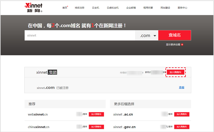 第二步:在【域名查詢(xún)結(jié)果頁(yè)】,將該域名【加入購(gòu)物車(chē)】