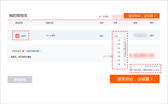 第四步:進(jìn)入【購(gòu)物車(chē)】,確認(rèn)域名內(nèi)容是否正確,選擇【注冊(cè)年限】,閱讀【新網(wǎng)域名注冊(cè)協(xié)議】