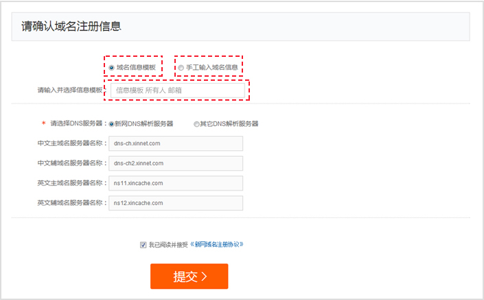 第六步:填寫(xiě)域名信息模板已有域名信息模板的,選擇【域名信息模板】,輸入關(guān)鍵字(信息模板名稱(chēng)、所有人、郵箱)查找模板;沒(méi)有域名信息模板的,選擇【手工輸入域名信息】,填寫(xiě)模板信息