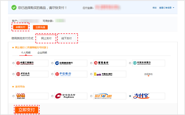 第七步:您有多種支付方式可選:余額支付、網(wǎng)上支付、線下支付,點(diǎn)擊立即支付,完成支付
