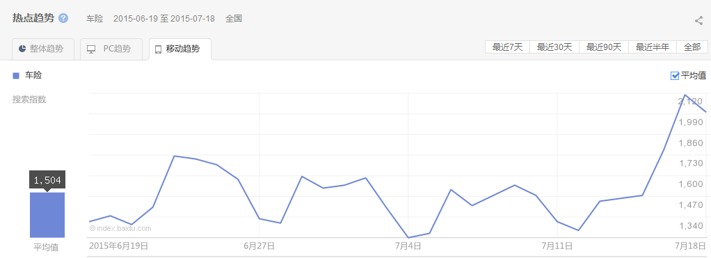 選定關(guān)鍵詞后,我們可以通過指數(shù)的趨勢來查看該關(guān)鍵詞具體的搜索趨勢以及PC端、WAP端所表現(xiàn)出來的不同的特點(diǎn),以“車險(xiǎn)”關(guān)鍵詞為例。