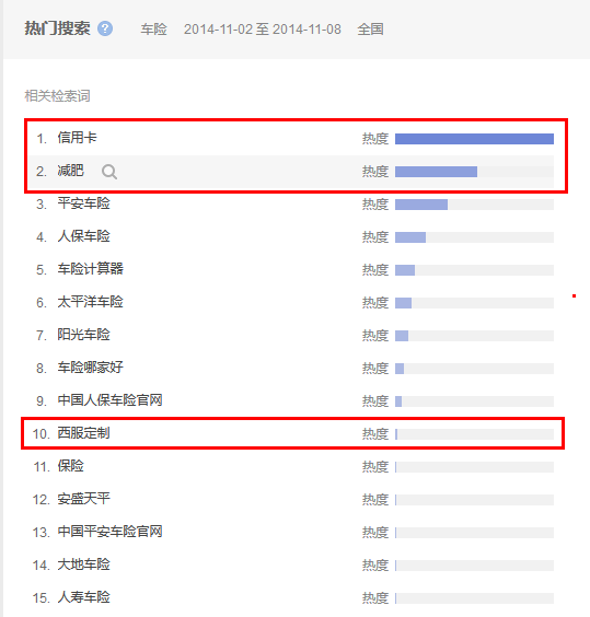從圖1-4的百度指數(shù)需求圖譜中,我們不難發(fā)現(xiàn),與車險(xiǎn)相關(guān)的檢索詞TOP10中,排名前2位的詞是“信用卡”、“減肥”;第10位則是“西服定制”,而非帶有車險(xiǎn)的關(guān)鍵詞。對(duì)此,我們可以初步斷定,關(guān)注車險(xiǎn)的網(wǎng)民群體中,極大一部分的人還關(guān)注信用卡(金融)、減肥(健康養(yǎng)生)、西服定制(服飾)等內(nèi)容。
