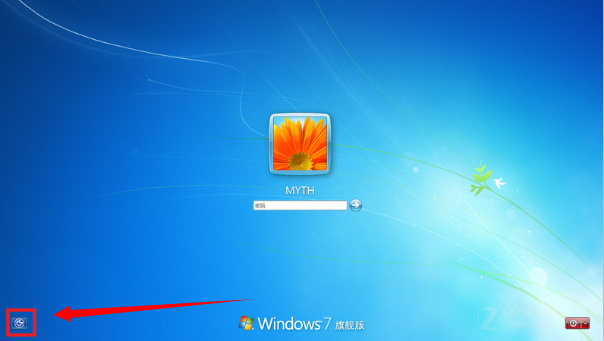 其次,關(guān)機(jī)進(jìn)入Win7系統(tǒng),在輸入密碼的界面,點(diǎn)擊左下角的工具按鈕。