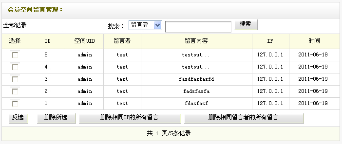 可以在上邊的留言管理中選擇指定的留言,進行“刪除所選”、“刪除相同IP的所有留言”和“刪除相同留言者的所有留言”操作。