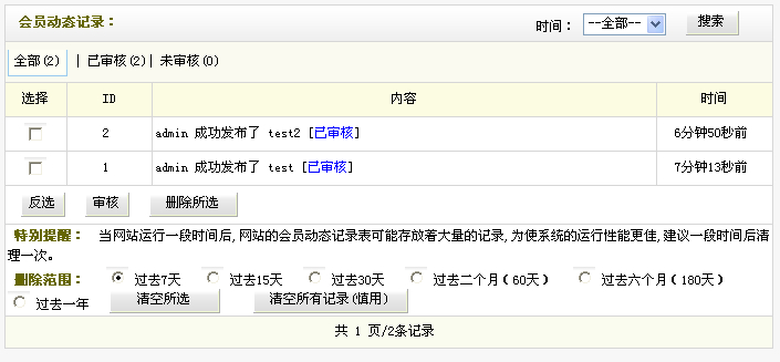 可以勾選指定ID的動態后,點擊“刪除所選”可以進行清理指定動態記錄;也可以點擊“審核”將所選動態審核通過。