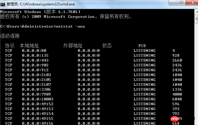 1.開始-》cmd-》輸入命令netstat -ano出現下圖所示(注意下邊顯示有些錯位,最后一列是PID):