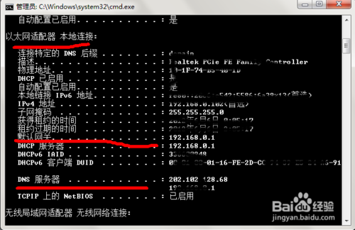 (3)如果(2)沒有問題,那你再輸入ping 你的網關地址,即你的路由器地址或者交換機的網關地址,一般為192.168.0(或者1).1。網關具體獲取方法是在命令行輸入ipconfig/all,然后找到你當前連接網絡類型對應的網關地址,如圖:圖中第二條紅線