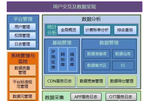 通過系統采集CDN服務日志,搭建CDN日志的大數據平臺進行多維度展示、分析, 不僅能夠使CDN服務透明化,同時也可以利用大數據平臺整合全量數據,通過海量數據的高效挖掘及定制化應用,為統計活動數據、總結運營經驗,實現流量精細化經營提供支撐。數據分析系統可以包括數據采集、基礎數據管理、CDN日志統計分析、數據寬表管理、平臺管理、系統管理與監控、用戶交互及數據呈現幾個模塊。