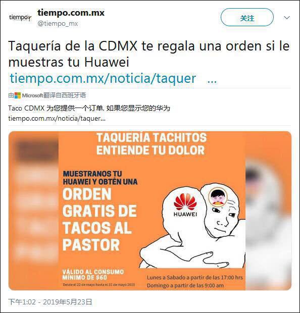 墨西哥一加餐廳日前貼出一張告示稱,只要是攜帶華為設備的食客,只要消費60比索,就能免費贈送一個玉米卷。海報還配了一張擁抱的圖片,表示理解華為,支持華為。