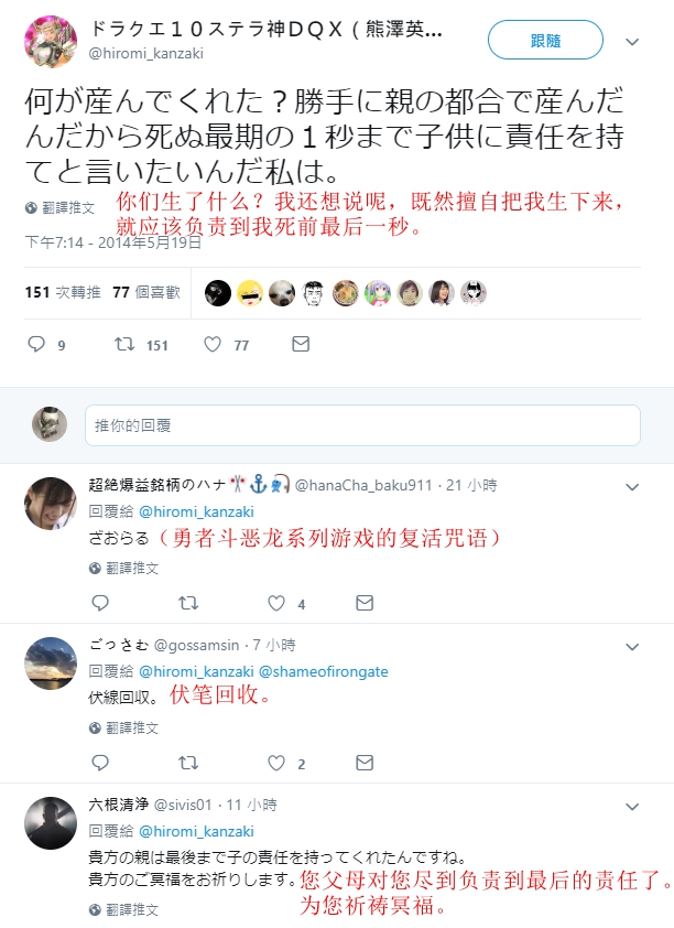 在網(wǎng)友貼出的該賬號過往言論中,還有一些則顯示推主疑似與父母關(guān)系不和。其中一條發(fā)表于2014年,內(nèi)容是:“既然擅自把我生下來,就應(yīng)該負責(zé)到我死前最后一秒。”