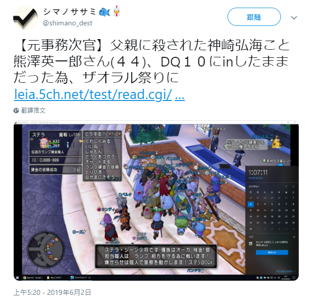 日本網(wǎng)友綜合該賬號的信息,推測其就是熊澤英一郎的賬號,甚至在他死前登陸著的游戲中為其虛擬角色舉行了復(fù)活儀式,有網(wǎng)友將游戲截圖也貼了出來: