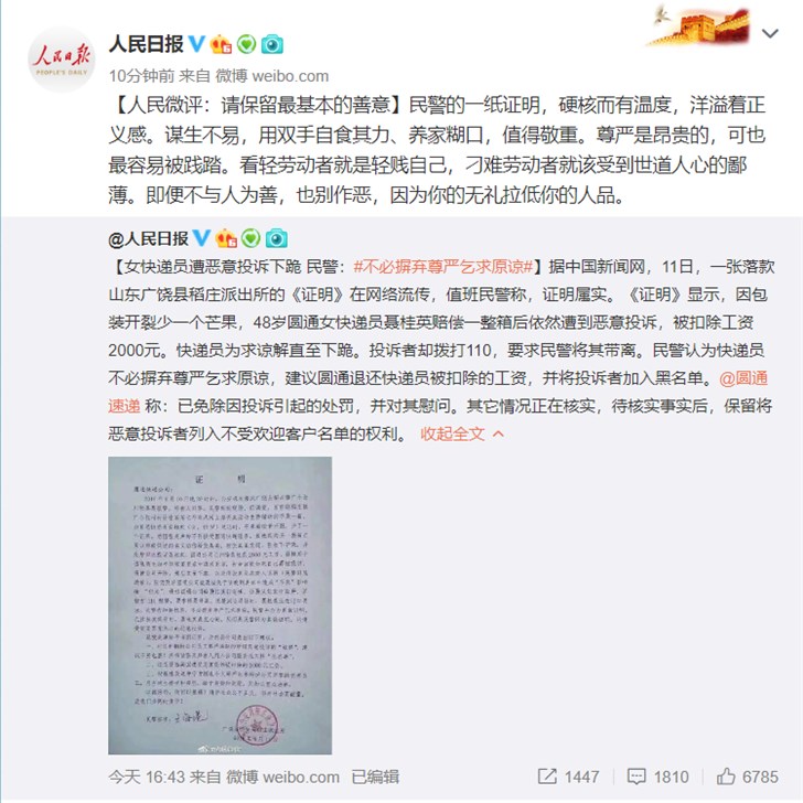 《證明》顯示,因包裝開(kāi)裂少一個(gè)芒果,48歲圓通女快遞員聶桂英賠償一整箱后依然遭到惡意投訴,被扣除工資2000元。快遞員遭投訴下跪也得不到原諒。投訴者卻撥打110,要求民警將其帶離。民警認(rèn)為快遞員不必摒棄尊嚴(yán)乞求原諒,建議圓通退還快遞員被扣除的工資,并將投訴者加入黑名單。事發(fā)后,圓通官方發(fā)表聲明稱(chēng)業(yè)務(wù)員所在網(wǎng)點(diǎn)已免除因投訴引起的處罰,并對(duì)其進(jìn)行慰問(wèn)。