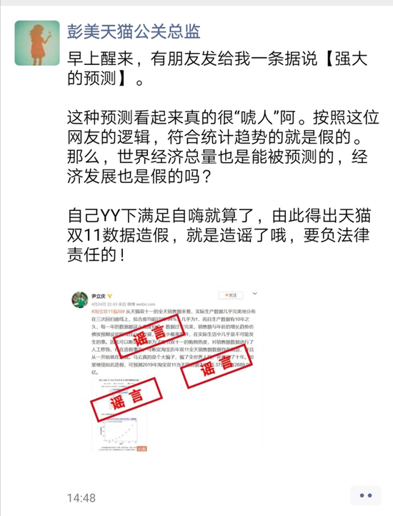 對此,天貓相關負責人回應稱,“按照網友的邏輯,符合統計趨勢的就是假的。那么,世界經濟總量也是能被預測的,經濟發展也是假的嗎?自己YY下滿足自嗨就算了,由此得出天貓雙11數據造假,就是造謠了哦,要負法律責任的!”