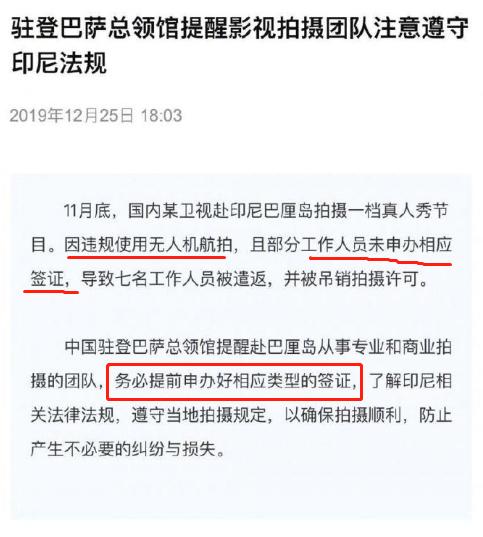 中國駐登巴薩總領館消息,11月底,國內某衛(wèi)視來巴厘島拍攝一檔真人秀節(jié)目。因違規(guī)使用無人機航拍,且部分工作人員未申辦相應簽證,導致七名工作人員被遣返,并被吊銷拍攝許可。此事被印尼媒體報道,造成不良影響。
