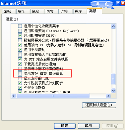打開瀏覽器-->選擇工具-->internet選項-->高級,在高級選項中有一個"顯示http友好錯誤提示"的復選框,請取消該復選框,這樣您可以獲得正確的錯誤提示。通過正確的錯誤提示,你就可以檢查具體的出錯原因,找準具體原因再進行相關調試即可。