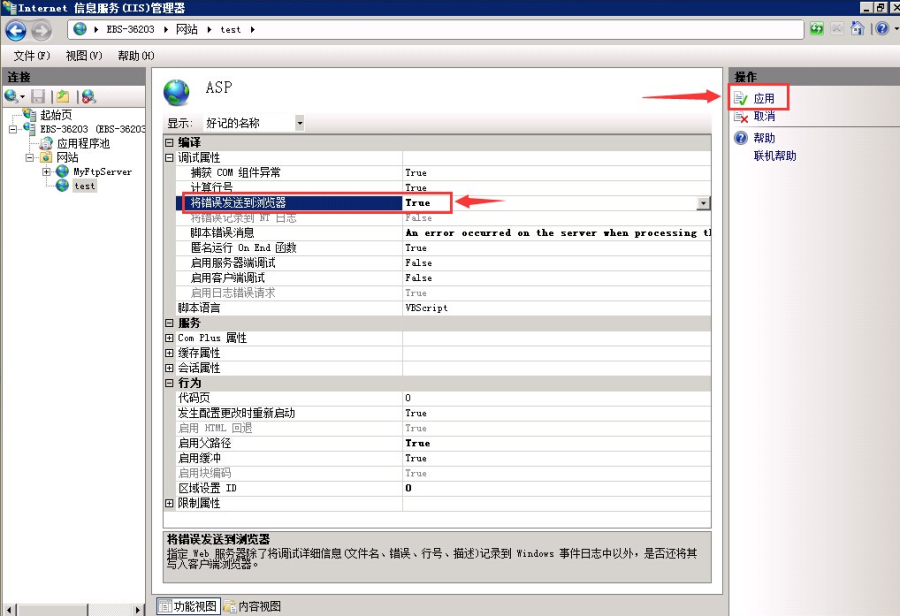 點擊需要設置的站點-->ASP選項卡-->在調試屬性中將錯誤發送到瀏覽器選擇true