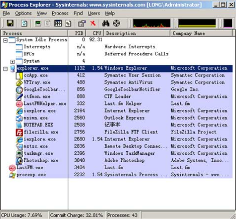 Process Explorer - Process Explorer是一款免費的進程監(jiān)視工具,功能比Windows自帶的任務(wù)管理器要強大的多,不僅可以監(jiān)視、暫停、終止進程,還可以查看進程調(diào)用的DLL文件,是預(yù)防病毒、查殺木馬的好幫手。
